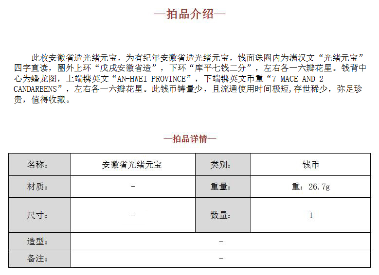此枚安徽省造光绪元宝,为有纪年安徽省造光绪元宝,钱面珠圈内为满汉文“光绪元宝”四字直读,圈外上环“戊戌安徽省造”,下环“库平七钱二分”,左右各一六瓣花星。钱背中心为蟠龙图,上端镌英文“AN-HWEI PROVINCE”,下端镌英文币重“7 MACE AND 2 CANDAREENS”,左右各一六瓣花星。此钱币铸量少,且流通使用时间极短,存世稀少,弥足珍贵,值得收藏。