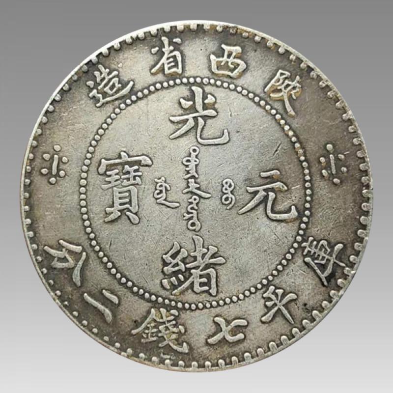 英国希顿造币厂为陕西代制的钢模运到陕西后,不巧正值清廷整顿各省造币厂,于是陕西停止了造币厂的筹备。因此,此币只留有试铸样币。该七钱二分样币,正面点圈内镌汉文和满文"光绪元宝"字样,上镌"陕西省造"五字,下镌"库平七钱二分"六字,两旁镌花饰。背面蟠龙居中,外圈为英文,并镌有"7"和"2"阿拉伯数字,两旁镌小花饰。