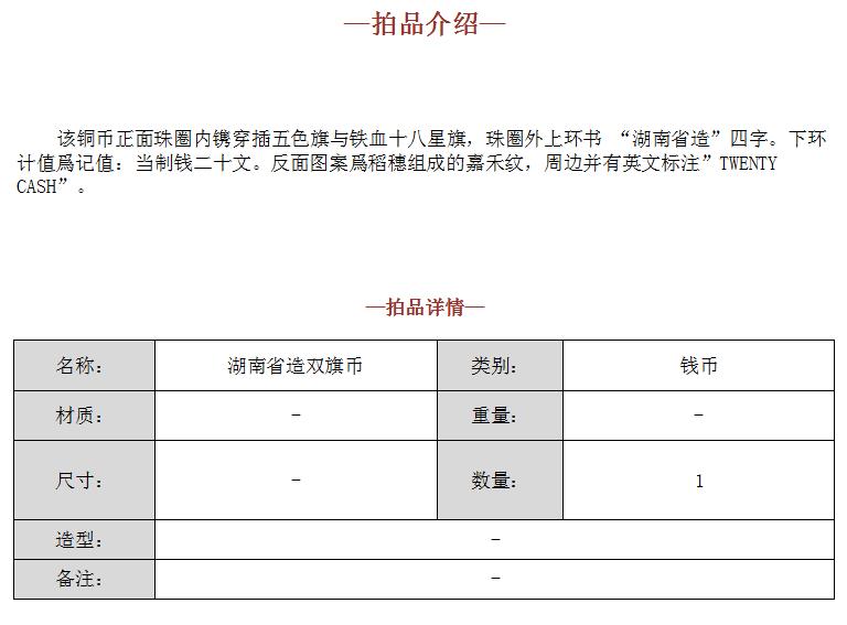 该铜币正面珠圈内镌穿插五色旗与铁血十八星旗,珠圈外上环书 “湖南省造”四字。下环计值爲记值:当制钱二十文。反面图案爲稻穗组成的嘉禾纹,周边并有英文标注”TWENTY CASH”。
