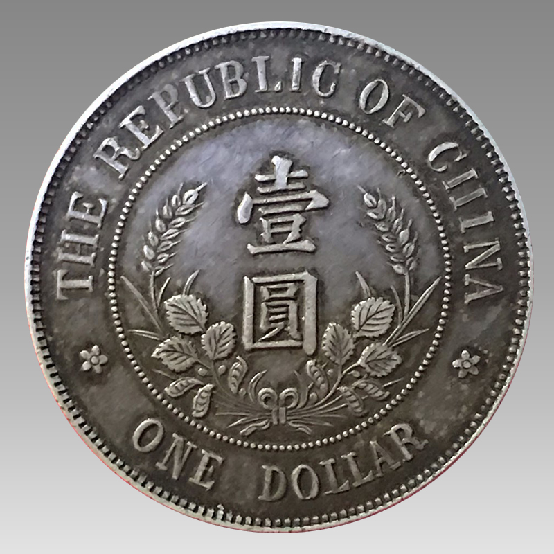 在我国近代发行的老银币中,纪念性银币仅十余种,大部分都是辛亥革命以后,各地实权人物制作的,其中由武汉造币厂铸造的黎元洪像开国纪念银元在这类纪念银币中是十分有名的,在当时其影响力仅次于孙中黎元洪无帽开国纪念币背面图案的中央部分是竖写的“壹圆”面额字样,珠圈外上环为英文翻译为“中华民国”字母,下环为英文翻译为“壹圆”字母,两侧4点钟和8点钟方位各有一枚有五瓣花星。