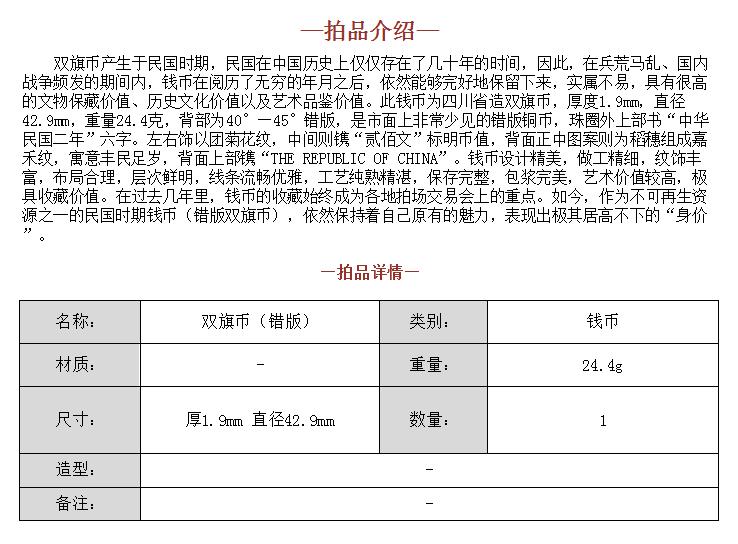 "双旗币产生于民国时期,民国在中国历史上仅仅存在了几十年的时间,因此,在兵荒马乱、国内战争频发的期间内,钱币在阅历了无穷的年月之后,依然能够完好地保留下来,实属不易,具有很高的文物保藏价值、历史文化价值以及艺术品鉴价值。此钱币为四川省造双旗币,厚度1.9mm,直径42.9mm,重量24.4克,背部为40°—45°错版,是市面上非常少见的错版铜币,珠圈外上部书“中华民国二年”六字。左右饰以团菊花纹,中间则镌“贰佰文”标明币值,背面正中图案则为稻穗组成嘉禾纹,寓意丰民足岁,背面上部镌“THE REPUBLIC