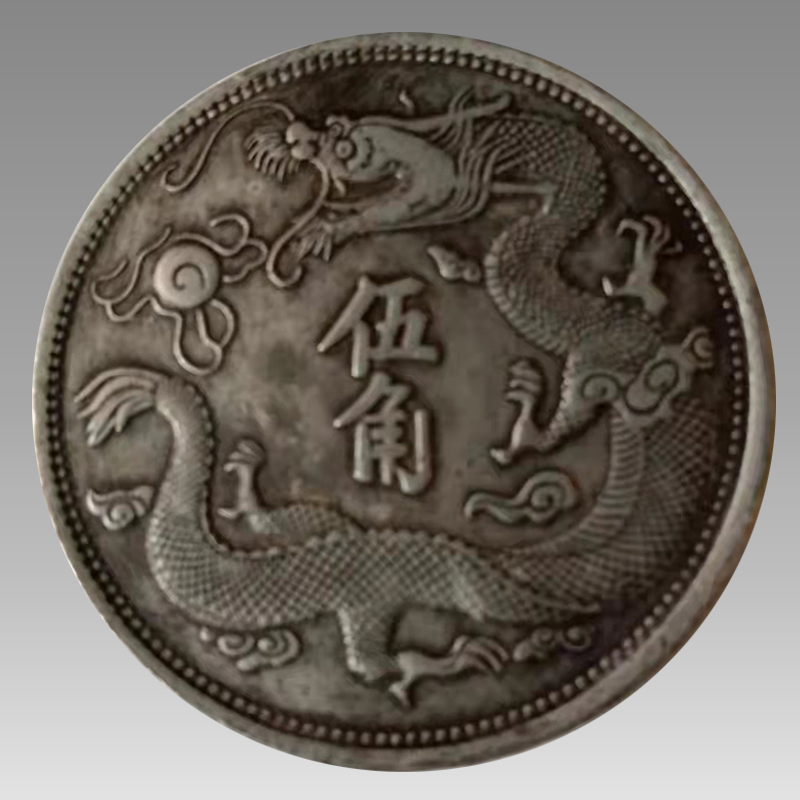 正面铸有“宣统三年大清银币二枚换一圆”字样。三点和九点位各饰花枝,枝叶雕刻精细。这枚银币币值“伍角”,即重库平三钱六分。其背面龙图设计在清代银币中别开新面,以唯一、罕见的跃腾欲起的“立龙”形式出现在银币龙面。立龙身旁饰六朵祥云,巨大的龙头,鼓起的龙眼、带牙的龙嘴、龙角、龙须构成了一个虎虎生威的龙形,张口喷出有别于其他大清银币的,位于币面左上方而非中央或下方的火龙珠。
