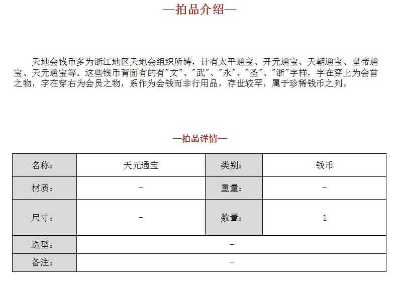 天地会钱币多为浙江地区天地会组织所铸,计有太平通宝、开元通宝、天朝通宝、皇帝通宝、天元通宝等。这些钱币背面有的有"文"、"武"、"永"、"圣"、"浙"字样,字在穿上为会首之物,字在穿右为会员之物,系作为会钱而非行用品,存世较罕,属于珍稀钱币之列。