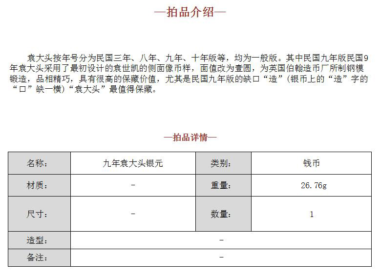 袁大头按年号分为民国三年、八年、九年、十年版等,均为一般版。其中民国九年版民国9年袁大头采用了最初设计的袁世凯的侧面像币样,面值改为壹圆,为英国伯翰造币厂所制钢模锻造,品相精巧,具有很高的保藏价值,尤其是民国九年版的缺口“造”(银币上的“造”字的“口”缺一横)“袁大头”最值得保藏。