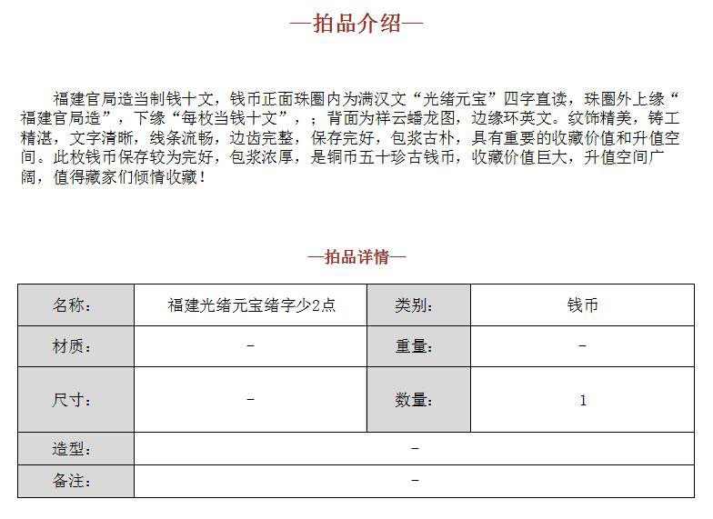 福建官局造当制钱十文,钱币正面珠圈内为满汉文“光绪元宝”四字直读,珠圈外上缘“福建官局造”,下缘“每枚当钱十文”,;背面为祥云蟠龙图,边缘环英文。纹饰精美,铸工精湛,文字清晰,线条流畅,边齿完整,保存完好,包浆古朴,具有重要的收藏价值和升值空间。此枚钱币保存较为完好,包浆浓厚,是铜币五十珍古钱币,收藏价值巨大,升值空间广阔,值得藏家们倾情收藏!