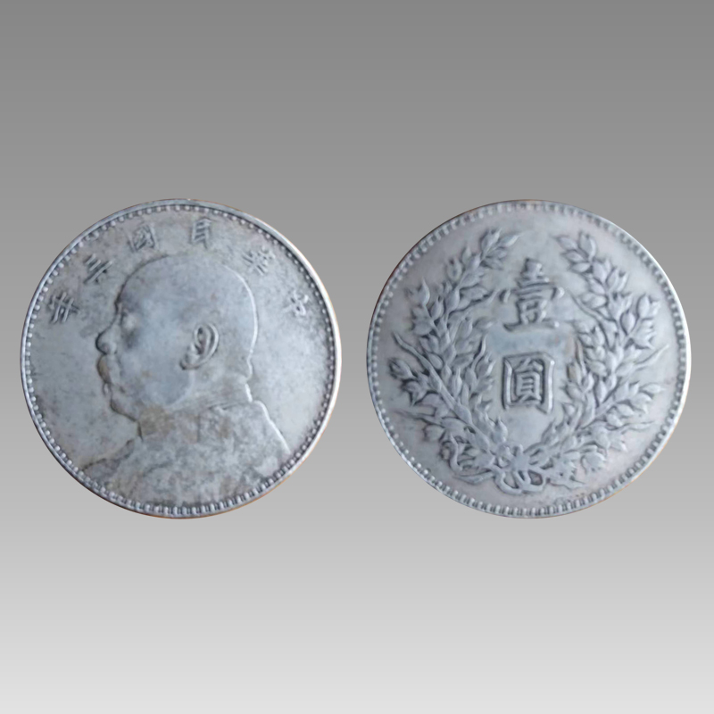 中华民国三年“袁大头”钱币,此币正面图案中间为袁世凯戎装左侧面像,上方铸“中华民国三年造”;背面图案为两株交错而立的嘉禾纹,中央为“壹圆”字样,外环为直齿边。品相完好,做工精细,此币人物及嘉禾纹饰、文字和圆边齿等图案皆清晰凸起,边齿规整,齿距排列均匀,内齿清晰匀称,较精美,值得收藏。