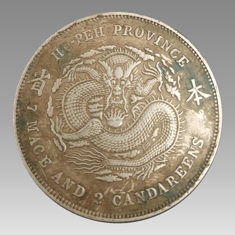 这枚湖北省造光绪元宝库平七钱二分银币,正面点圈内镌汉文和满文“光绪元宝”字样,上铸“湖北省造”四字,下镌“库平七钱二分”六字,字体为楷书,左右两侧各镌一个六花星。背面蟠龙居中,外圈为英文,两旁镌“本省”二字。该币因在全国首次试铸“本省”字样,字体俊秀,铸工精美,为中国银币二十珍之一