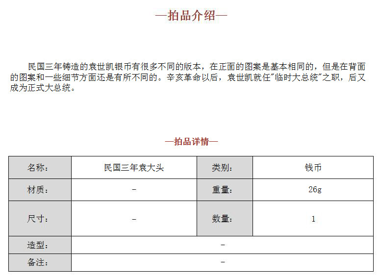 民国三年铸造的袁世凯银币有很多不同的版本,在正面的图案是基本相同的,但是在背面的图案和一些细节方面还是有所不同的。辛亥革命以后,袁世凯就任"临时大总统"之职,后又成为正式大总统。