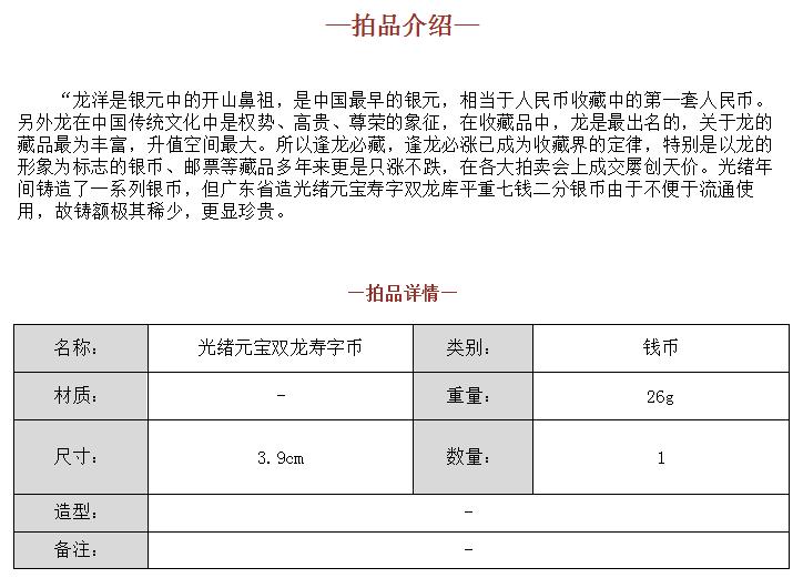 “龙洋是银元中的开山鼻祖,是中国最早的银元,相当于人民币收藏中的第一套人民币。另外龙在中国传统文化中是权势、高贵、尊荣的象征,在收藏品中,龙是最出名的,关于龙的藏品最为丰富,升值空间最大。所以逢龙必藏,逢龙必涨已成为收藏界的定律,特别是以龙的形象为标志的银币、邮票等藏品多年来更是只涨不跌,在各大拍卖会上成交屡创天价。光绪年间铸造了一系列银币,但广东省造光绪元宝寿字双龙库平重七钱二分银币由于不便于流通使用,故铸额极其稀少,更显珍贵。