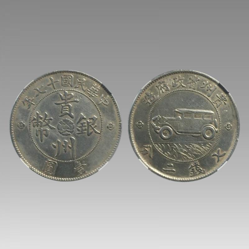 正面中央为“贵州银币”上铭“中华民国十七年”,下铭“一圆”:背面中央为草地、汽车图案,上铭“贵州省政府造”,下铭记重“七钱二分”,是民国十七年(1928年)贵州造币厂为纪念贵阳-桐梓公路通车而制造的,草地内含当时省政府主席周西成的“西成”2字。
