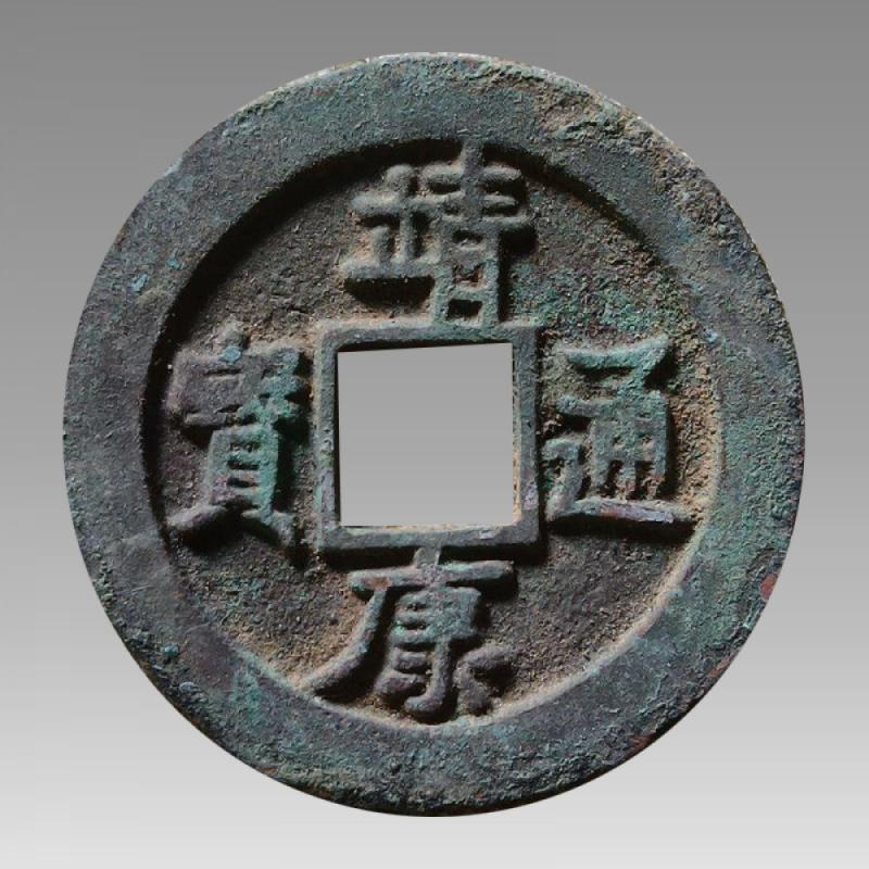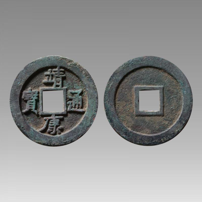 靖康通宝是中国古代钱币之一,是北宋宋钦宗时期铸造的,属国家一级文物,靖康通宝币质为铜、铁、银。靖康通宝折三篆书大钱,