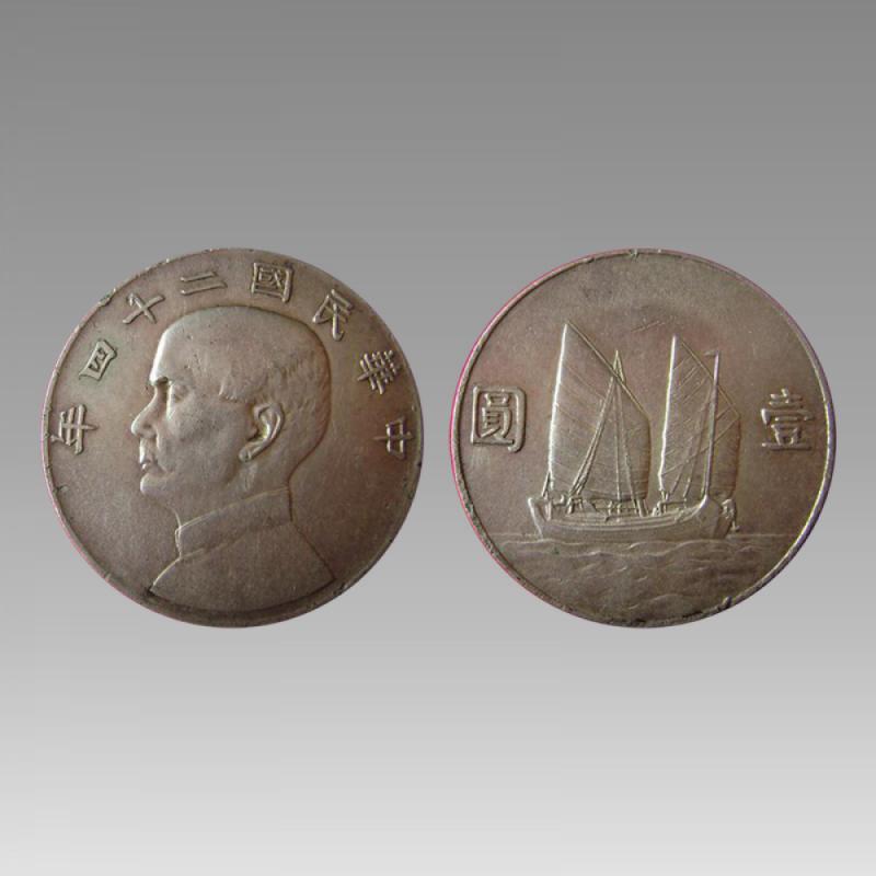 正面为孙中山像,背面镌一轮金光闪闪的太阳,中间为帆船在乘风破浪前进;1933年和1934年,民国政府铸造了正面镌孙中山像,背面镌一艘帆船乘风破浪前进,俗称“船洋”