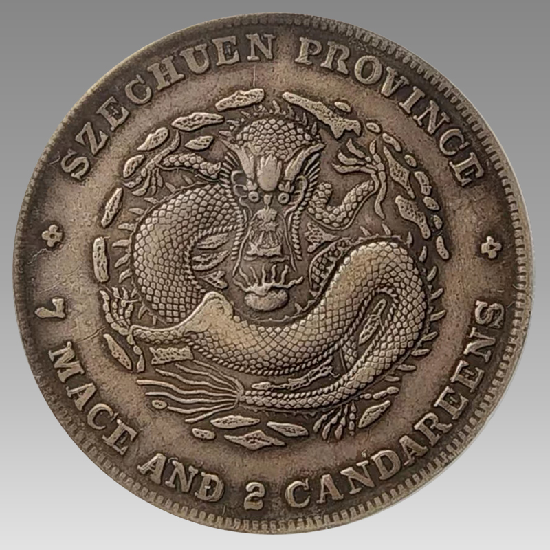 四川省造光绪元宝库平七钱二分银币,这枚罕见的银样压印清晰,包浆均匀,非常难得。这枚令人印象深刻的四川省造光绪元宝,填补了近代中国造币史上重要的一段空白。正面为全部是文字形式,外周上方“四川省造”下书“库平七钱二分”,左右两侧间以十字花星。珠圈内光绪元宝四字汉文,中心小字为同义的满文。背面中心为蟠龙图,品相精致,不失为一件珍品。