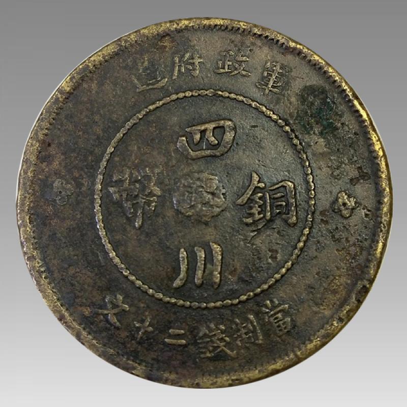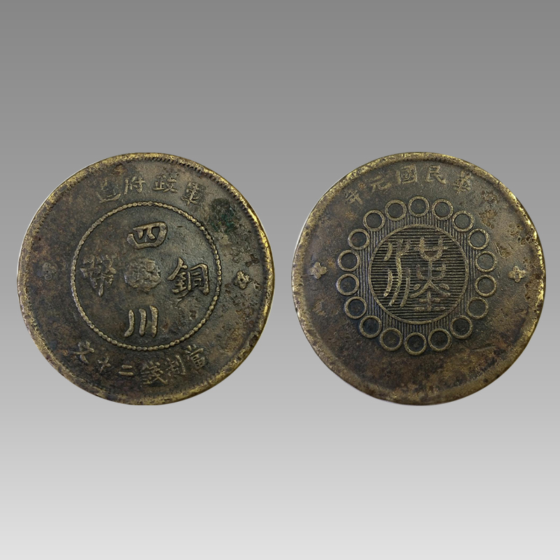 正面为“四川铜币”四字,中问有一枚海棠花,上有“军政府造”,下边为当制钱若干文,反面中问有一圈,圈内为篆文“汉”字,圈外还环绕有十八个小圈,小圈上有“中华民国元年”六字。