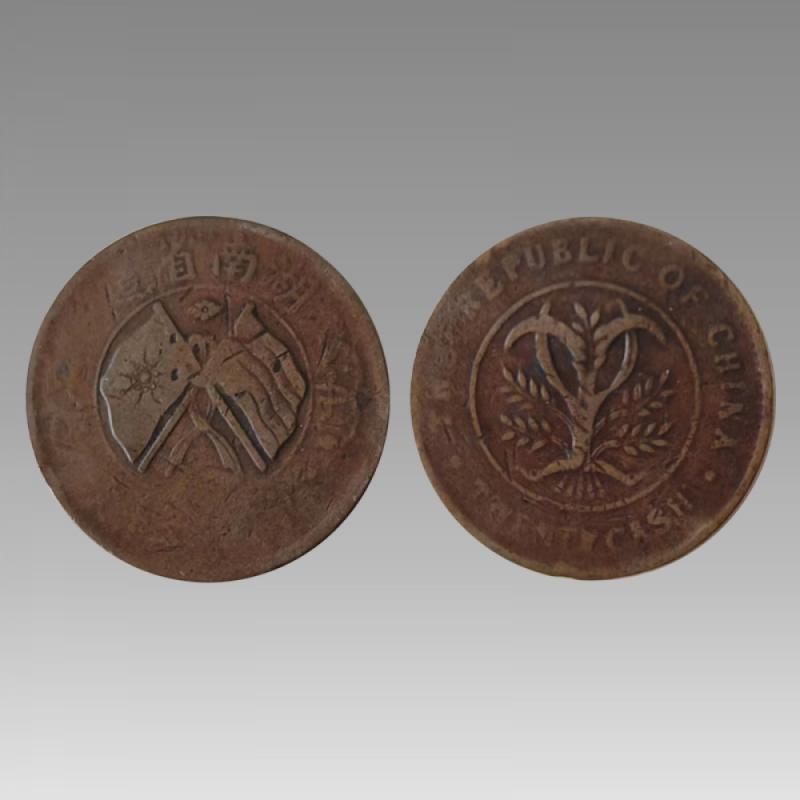 中华民国开国留念币主要是以替代清代铜币模本,鼓舞铸造留念币。湖南省造双旗币当制钱二十文,就是诞生于这一前史时期,带着该前史时期显着的前史特征,前史含义深远,价值深沉!由于民国时期我国战乱不断,当二十文损失较为惨重,目前其存世量有限。