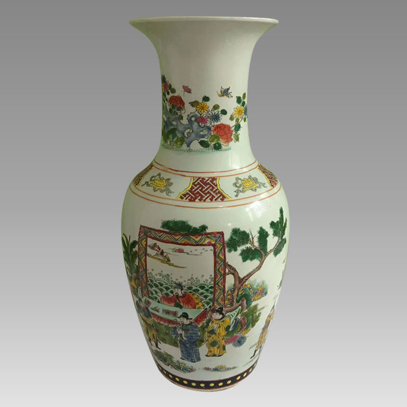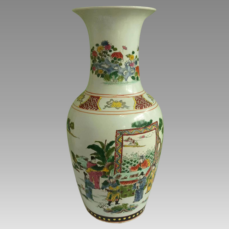 此件为五彩人物赏瓶,通体施白釉,器身主绘人物故事图,画面中的人物绘得五官立体,表情自然,动作流畅,衣服褶皱凸显,刻画传神。画面用笔自如,技法娴熟,苍劲老练,设色清丽,色料浓淡相宜,给人以清新明快之感,此器历经岁月沧桑,品相完整,釉色莹泽,画工精绝,包浆醇厚,甚为难得,实乃收藏之珍品也。