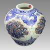 此罐直口,短颈,溜肩,鼓腹,圈足,砂底无釉。附狮纽伞形盖。胎体上薄下厚,胎质细腻。青花色彩浓艳,釉里红略暗。通体青花釉里红纹饰。罐盖绘青花莲瓣纹、卷草纹、回纹各一周。罐身近口沿处绘青花缠枝花纹、卷草纹各一周。肩部绘下垂如意云头纹,云头纹内绘青花水波纹托白莲,云头纹之间绘折枝牡丹纹。腹部四面堆塑双菱形串珠开光,开光内镂雕山石、牡丹、菊花等四季园景,以釉里红绘山石、花卉,青花绘花叶,纹饰有浮雕效果。腹下部饰青花折枝莲花,与肩部云头纹相对应。近底处绘卷草纹及变形莲瓣纹,莲瓣纹内绘倒垂宝相花纹。