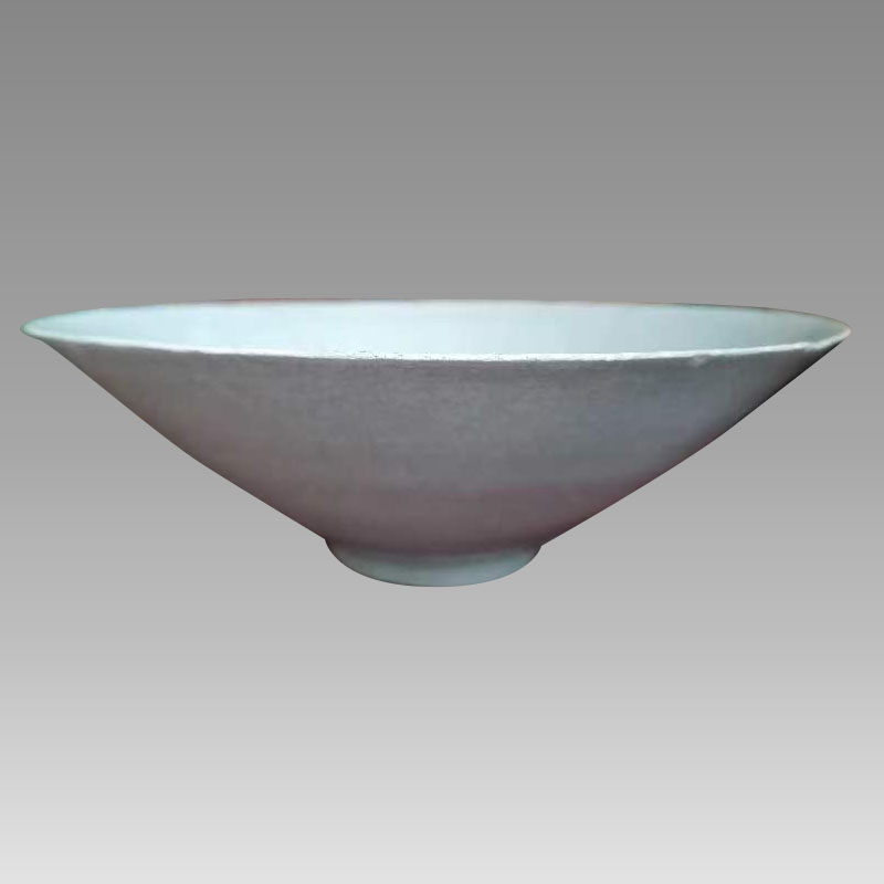 "该藏品为宋代湖田窑影青划花斗笠碗,高6厘米,碗口平面直径17.5厘米,足径5.2厘米,体施青白釉。敞口、腹壁斜收,呈45度斜出,形如斗笠。碗外光素,内划花卉纹,划花行云流水。该碗胎体极薄,胎壁可透光,造型轻巧。青白瓷,清淡高雅,俊秀挺拔,享有“饶玉”之称。这种青白瓷器因釉色青中显白,白中泛青,又称为影青(它是我国陶瓷史上一个极其珍贵的品类)。此展品划花图案清晰流畅,毫无造作之感。轻轻敲击,就能听到清脆的响声。“薄如纸,声如磬”,正是该藏品的真实写照。国内类似藏品现收藏于湖北省襄阳市博物馆。该藏品圈足周正