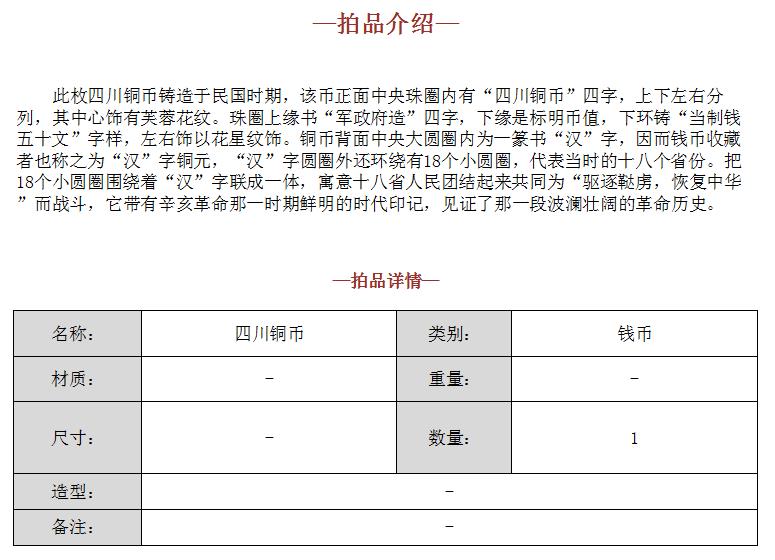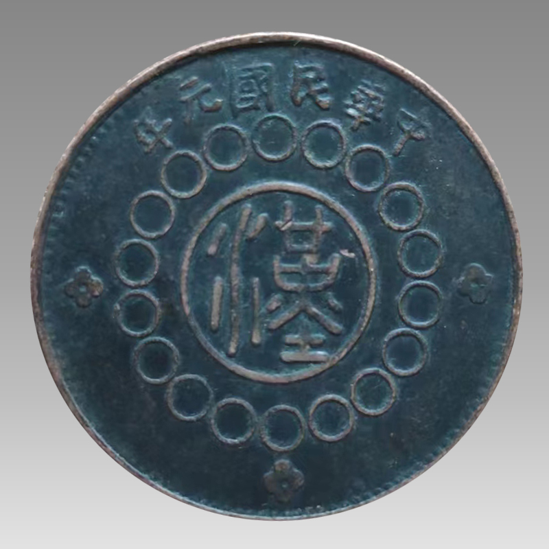 此枚四川铜币铸造于民国时期,该币正面中央珠圈内有“四川铜币”四字,上下左右分列,其中心饰有芙蓉花纹。珠圈上缘书“军政府造”四字,下缘是标明币值,下环铸“当制钱五十文”字样,左右饰以花星纹饰。铜币背面中央大圆圈内为一篆书“汉”字,因而钱币收藏者也称之为“汉”字铜元,“汉”字圆圈外还环绕有18个小圆圈,代表当时的十八个省份。把18个小圆圈围绕着“汉”字联成一体,寓意十八省人民团结起来共同为“驱逐鞑虏,恢复中华”而战斗,它带有辛亥革命那一时期鲜明的时代印记,见证了那一段波澜壮阔的革命历史。