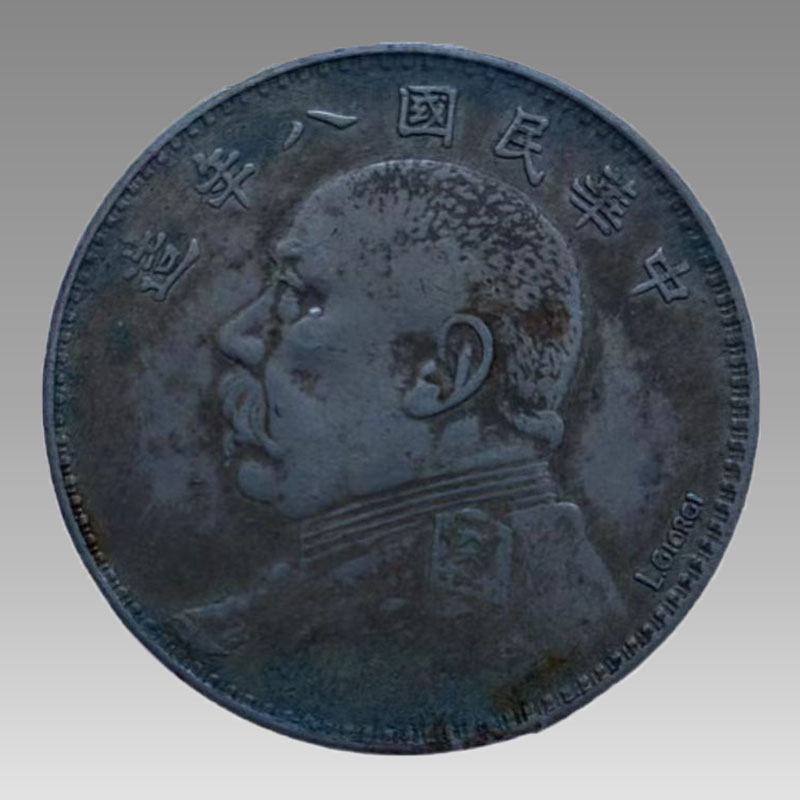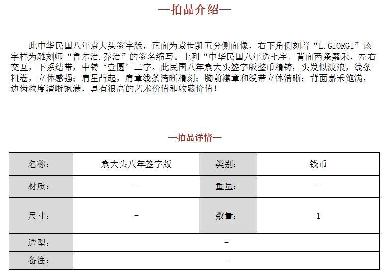 此中华民国八年袁大头签字版,正面为袁世凯五分侧面像,右下角侧刻着“L.GIORGI”该字样为雕刻师“鲁尔治.乔治”的签名缩写。上列“中华民国八年造七字,背面两条嘉禾,左右交互,下系结带,中铸‘壹圆’二字。此民国八年袁大头签字版整币精铸,头发似波浪,线条粗卷,立体感强;肩星凸起,肩章线条清晰精刻;胸前襟章和绶带立体清晰;背面嘉禾饱满,边齿粒度清晰饱满,具有很高的艺术价值和收藏价值!