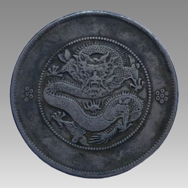 此枚云南省造光绪元宝库平七钱二分钱币。正面以珠圈为界,可分为内外两个部分,钱币珠圈内铸“光绪元宝”四字,上环“云南省造”四字,下环“库平七钱二分”,左右两端饰有七点星花,字体端庄清秀,笔画圆润饱满,楷书文字书法极为精湛、大气,间架结构平衡舒展,在龙洋里首屈一指,堪称精品。钱币背面是蟠龙图,纹路如刀刻所成,龙身纹路精美。