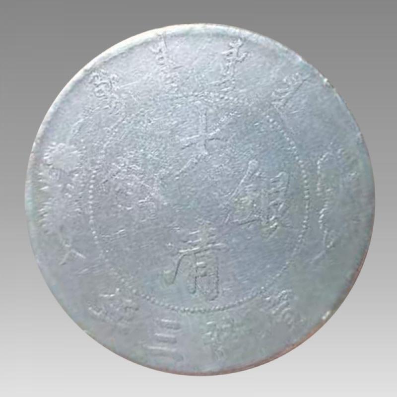 "大清银币铸于宣统三年(1911),户部造币总厂制造。该厂设于天津,其中进入流通领域的大清银币只有曲须龙一种。龙是我国古代传说中一种有鳞有爪并能兴风作雨的神圣灵异动物。此枚钱币正面中文“大清银币”,外圈围上部4字同义满文,下有“宣统三年”字样。左右分列花饰。背面有“壹圆”字样,外围龙纹,为曲须龙戏珠图样。下有英文“ONE DOLLAR”字样。