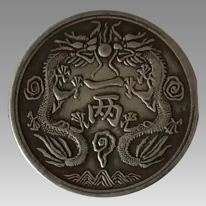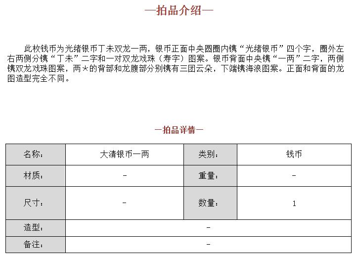 此枚钱币为光绪银币丁未双龙一两,银币正面中央圆圈内镌“光绪银币”四个字,圈外左右两侧分镌“丁未”二字和一对双龙戏珠(寿字)图案。银币背面中央镌“一两”二字,两侧镌双龙戏珠图案,两*的背部和龙腹部分别镌有三团云朵,下端镌海浪图案。正面和背面的龙图造型完全不同。