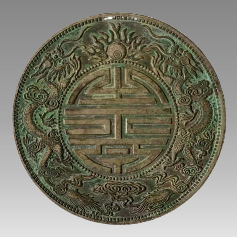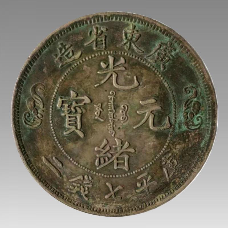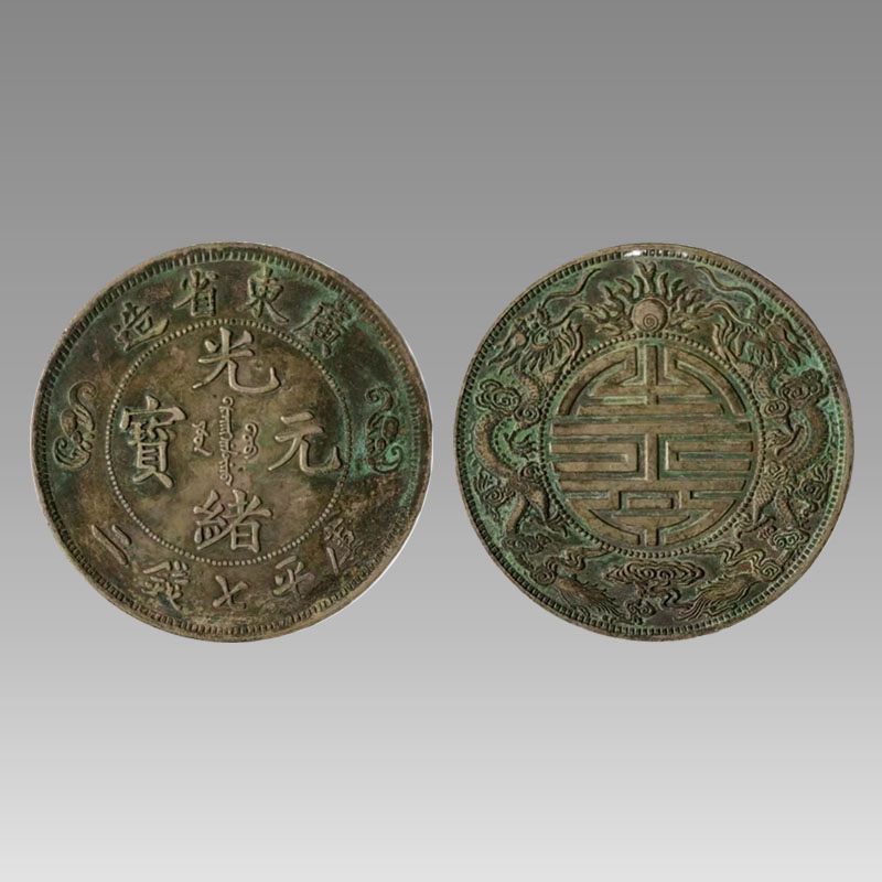 此广东省造光绪元宝双龙寿字币库平七钱二分,该银币正面珠圈外上端镌刻“广东省造”四字,下端镌刻楷书“库平七钱二”五字,左右两侧各镌有一蝙蝠图案,珠圈内铸有满汉文“光绪元宝”四字。银币背面珠圈外铸双龙戏珠图案,珠圈内铸一圆形“寿”字。银币设计极富特色,正面两侧所铸的一对蝙蝠图案寓意吉祥。因蝙蝠的“蝠”字与“福”字谐音,与背面的“寿”字相对应,寓意“福寿双全”。由于广东省当时铸造此币的目的是奉献清廷以祝慈禧太后万寿,所以铸额不大,大多奉献给清廷或赠于当时的达官显贵,见于民间流通的很少。