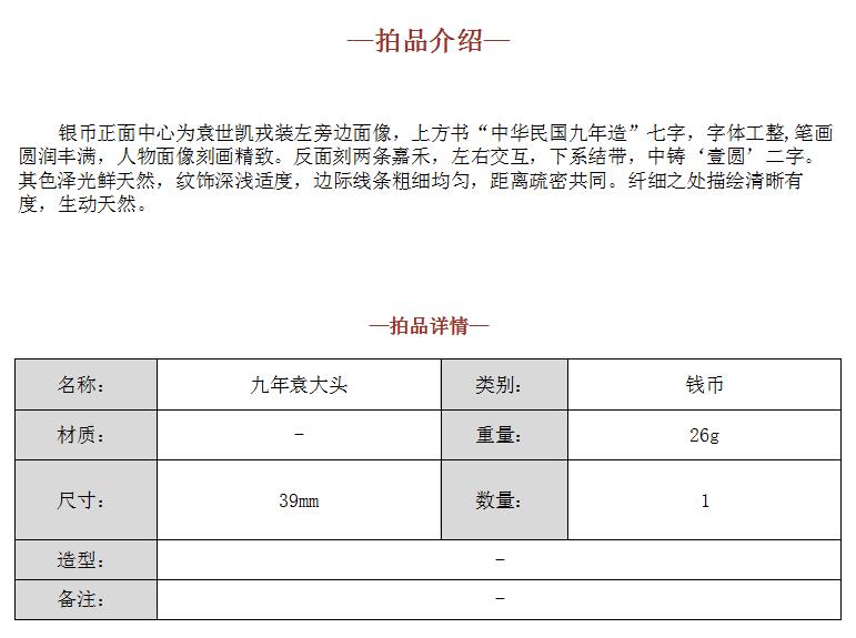 银币正面中心为袁世凯戎装左旁边面像,上方书“中华民国九年造”七字,字体工整,笔画圆润丰满,人物面像刻画精致。反面刻两条嘉禾,左右交互,下系结带,中铸‘壹圆’二字。其色泽光鲜天然,纹饰深浅适度,边际线条粗细均匀,距离疏密共同。纤细之处描绘清晰有度,生动天然。