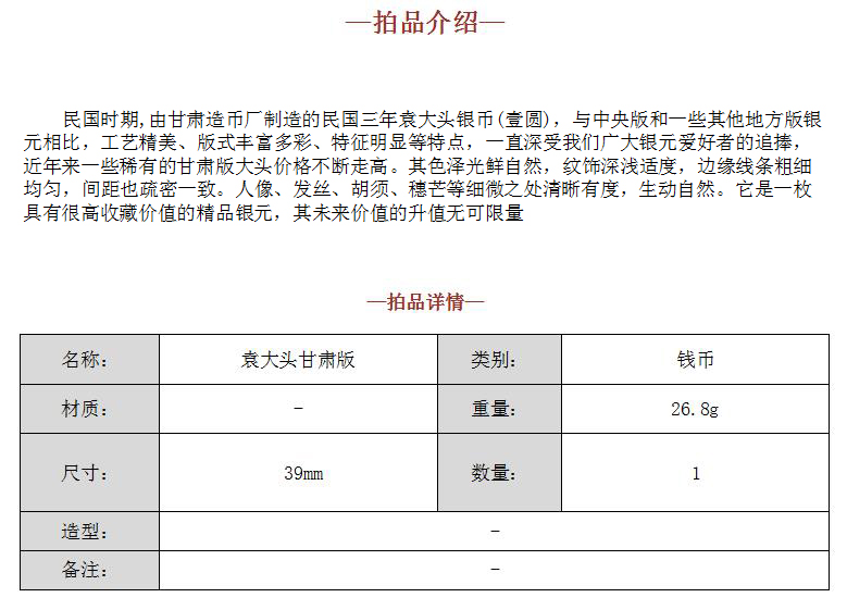 民国时期,由甘肃造币厂制造的民国三年袁大头银币(壹圆),与中央版和一些其他地方版银元相比,工艺精美、版式丰富多彩、特征明显等特点,一直深受我们广大银元爱好者的追捧,近年来一些稀有的甘肃版大头价格不断走高。其色泽光鲜自然,纹饰深浅适度,边缘线条粗细均匀,间距也疏密一致。人像、发丝、胡须、穗芒等细微之处清晰有度,生动自然。它是一枚具有很高收藏价值的精品银元,其未来价值的升值无可限量
