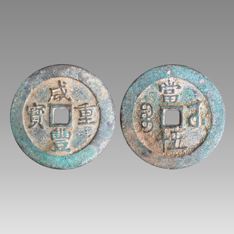 咸丰钱币虽然不是中国最早的铸币,但咸丰重宝当五十至今仍被喻为钱币之首,它的铸期最长、数量最多、版式最丰富、流通度最广。黄铜质的原料,加上精良优美的外形,雕刻细腻的工笔,铜光闪闪的大字,古生古韵的包浆,就连细节处都是精雕细琢、几乎完美,实为艺术品市场中千年不遇的第一珍藏货币。
