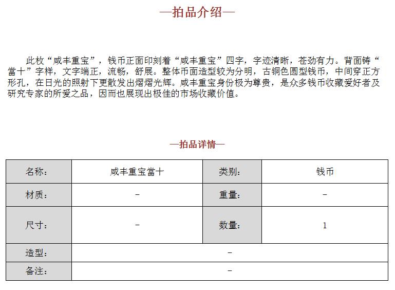 此枚“咸丰重宝”,钱币正面印刻着“咸丰重宝”四字,字迹清晰,苍劲有力。背面铸“當十”字样,文字端正,流畅,舒展。整体币面造型较为分明,古铜色圆型钱币,中间穿正方形孔,在日光的照射下更散发出熠熠光辉。咸丰重宝身份极为尊贵,是众多钱币收藏爱好者及研究专家的所爱之品,因而也展现出极佳的市场收藏价值。
