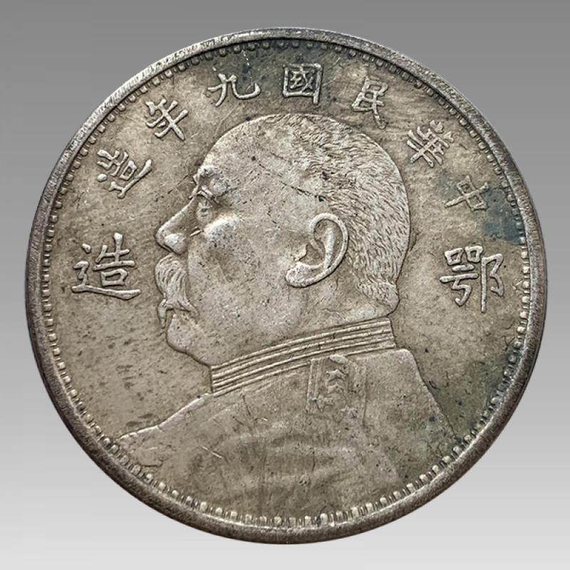 中华民国九年袁大头壹圆鄂造,银币正面为袁世凯侧面肖像,钱币上端铸有“中华民国九年造”七字,肖像两边铸“鄂造”二字,字体清秀,洒脱自然,笔画刚劲有力。钱币背面两条嘉禾左右交互,下系结带,纹饰中铸“壹圆”字样,笔画圆润饱满,字体秀美,浮雕感明显,用手触之可感受到凹凸有致的纹饰。