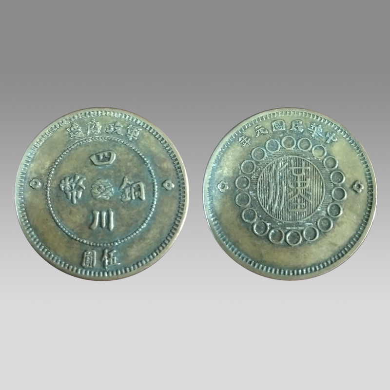 银元正面图案中央是一朵精芙蓉花,象征蓉城成都;花的四周环有“四川银币”四字,上方是“军政府造”四字,下方是面额“伍圆”字样,两侧仍有四瓣花星;背面图案中央是一个很大的篆书“汉”字,代表了新政府“大汉”的意思,具有反清意义。“汉”字周围有18个小圆圈,象征着当年响应辛亥革命的十八个省,两侧有四瓣花星,上方有“民国元年”六字它带有辛亥革命那一时期鲜明的时代印记,见证了那一段波澜壮阔的革命历史,弥足珍贵。